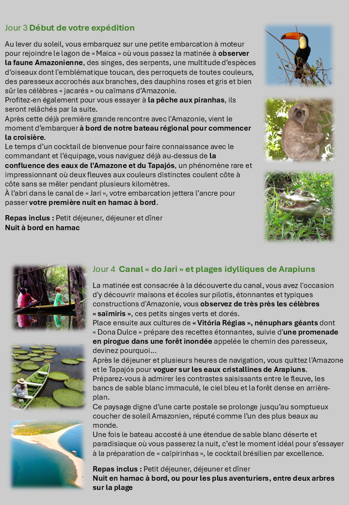 d’inattendues et magnifiques plages de sable blanc, des lagons luxuriants, des igarapés (sources d’eaux pures et fraîches) quittant la dense végétation de la forêt